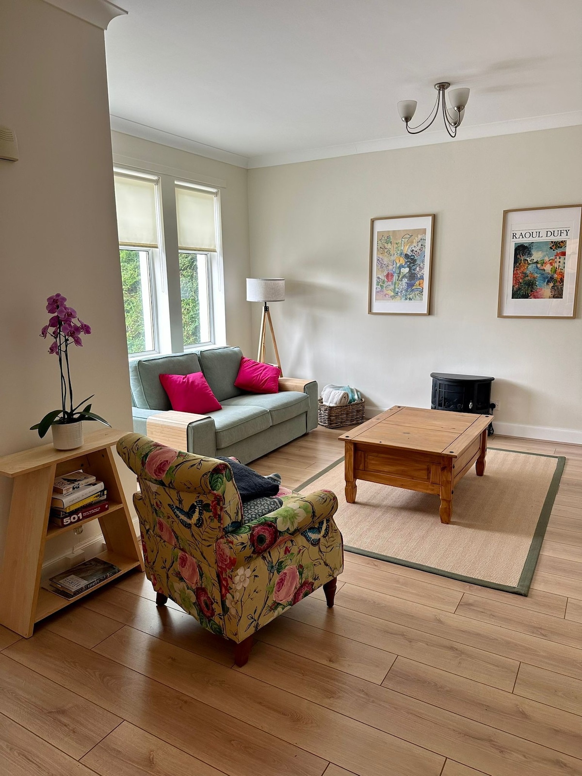 Self-contained private annex with lounge/small food prep area and separate bedroom, en suite/electric shower and storage cupboard. Lounge has a 43” 4K Smart TV with Freeview and Netflix. Ethernet and WiFi. There are complimentary tea/coffee/snacks. (Nespresso machine/milk frother) fridge, microwave, portable hob and kettle. Continental breakfast is included in the apartment on arrival. Private entrance/keylock/ garden/patio. For longer stays clothes washing/drying by arrangement.