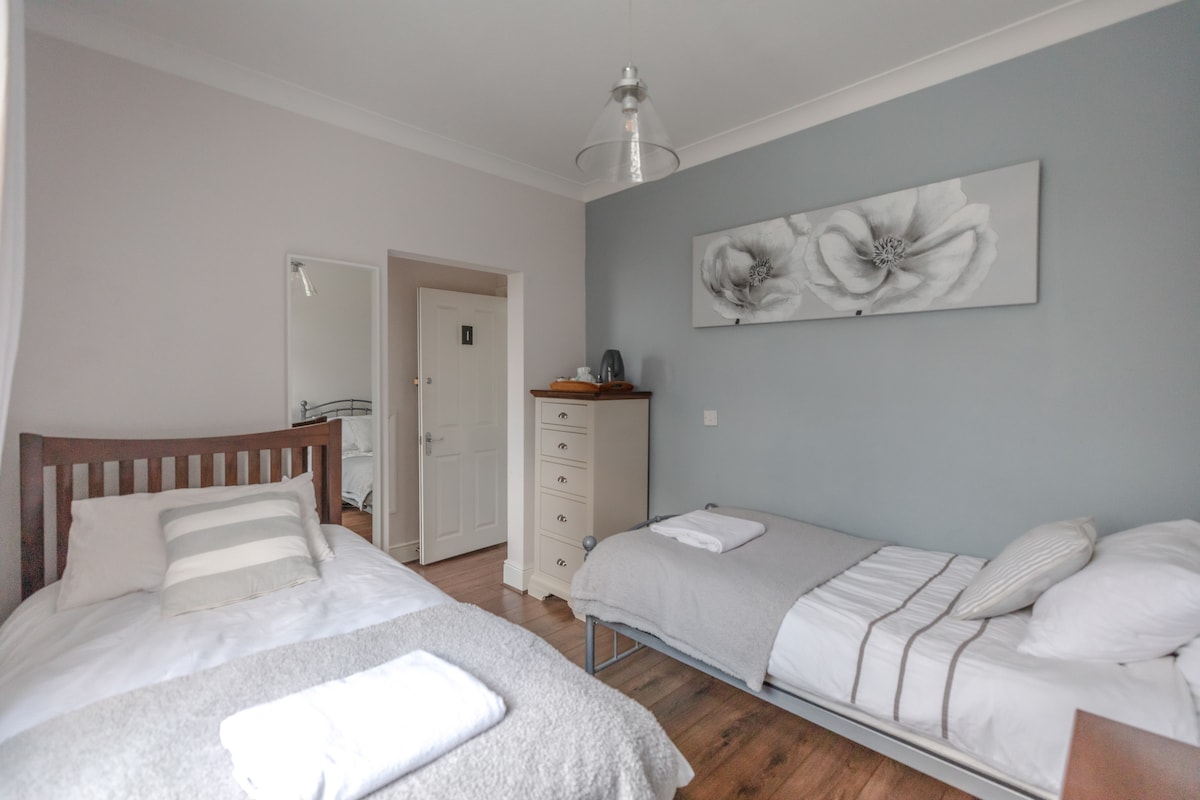 We welcome you to the Huffy House. It’s a quiet location overlooking gardens with views of surrounding hills. Access is at the rear of the house through the conservatory; where you’ll find your front door. There’s is a key lock on the side of the conservatory door with a key to that door and your front door. We do offer tea, coffee and milk together with a basic breakfast on arrival of bread, butter, jams and cereal. There’s water and orange juice in the fridge as well.