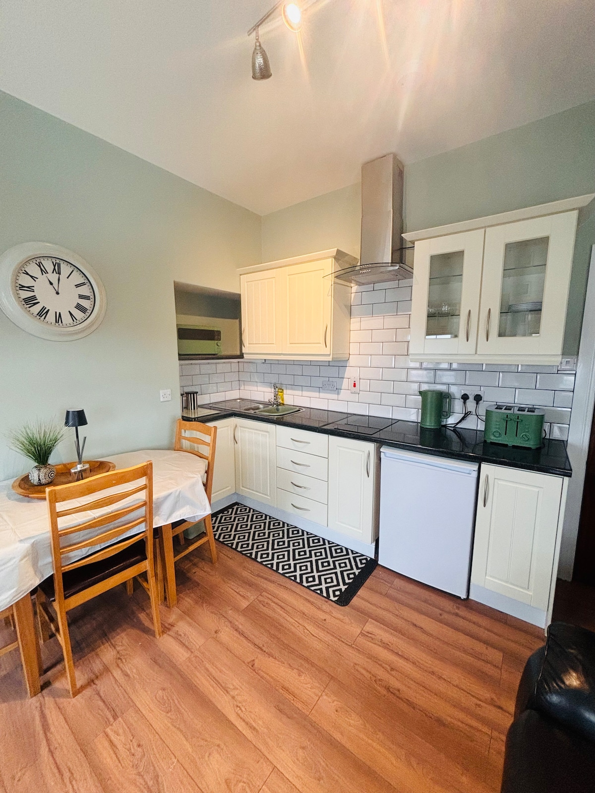 1 bedroom apartment on the first floor with a large bedroom ensuite and a couch bed in living room apartment has had a full refurbishment done and all furniture and fittings brand new just behind the main street in letterkenny close to everything loads of hot water and towels and toiletries. teas coffees cereals milk and orange juice