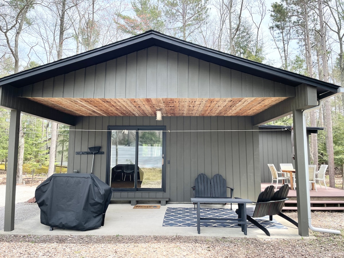 Welcome to our private Tiny Villa! It is completely stocked with dishes, cookware, gas grill, beach chairs, towels, wifi, fire pit etc… Tucked away overlooking the pond, it’s a perfect place to relax after a day of activity. An easy 20 minutes to Traverse City where you can go to the beach, shop or enjoy many excellent restaurants. Firewood available on site & have the following to RENT: Pontoon, kayaks, & paddle boards ( Contact H2O Sports Rentals to book these items or message us)