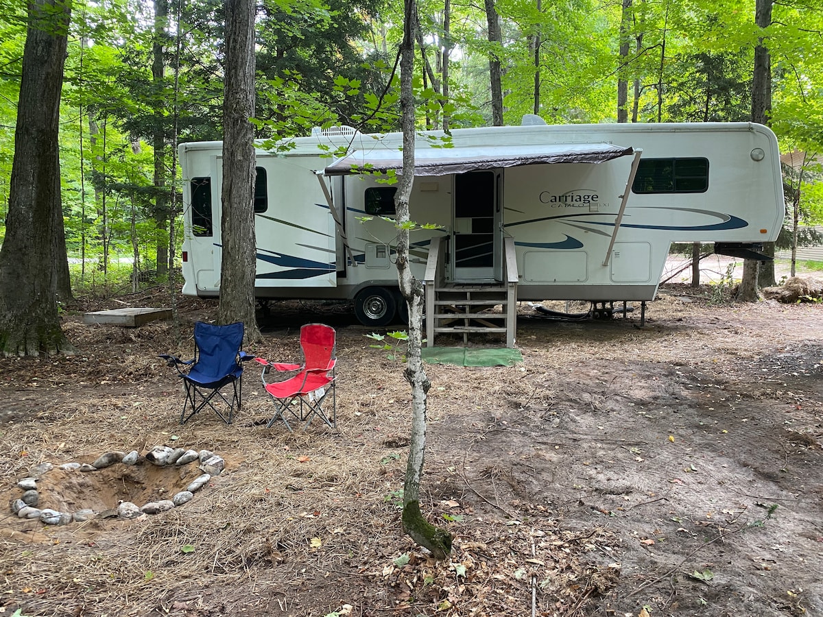The Betsie Camper - Excellent condition 35ft Fifth wheel camper in our back yard woods. Sleeps 6 - Queen Bed, Sofa Bed and Queen Air Mattresses . We own 20 acres of woods with several trails through the woods. Has water, electricity, Air Conditioning, a refrigerator, stove top and cooking stove, shower and other basic necessities. The camper is several feet from the house so you will have your own privacy. There is an outdoor hot tub and fire pit that is available for use.