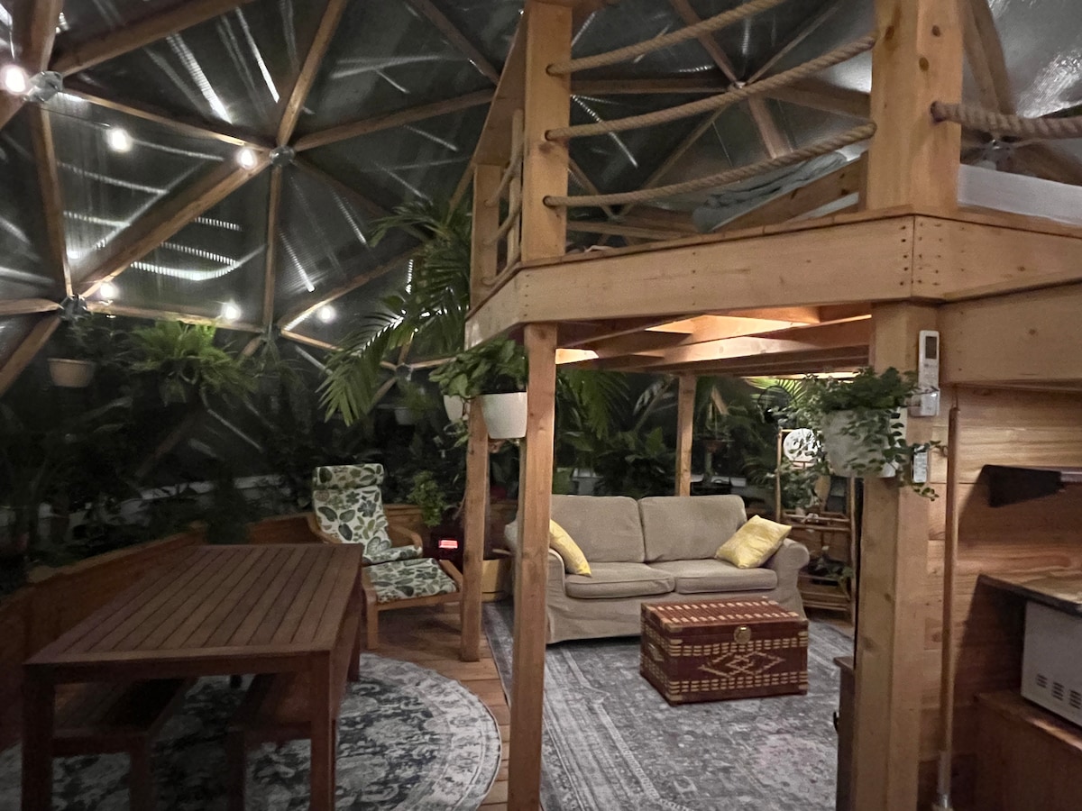 Jungle Dome on a farm in Burlington! Enjoy a tropical stay in our 500 square foot geodesic dome “glamping” greenhouse dwelling! Sleeps 4. Complete with a fish and turtle pond and filled to the brim with tropical plants! Designed to be a tropical vacation getaway when you can’t get away to the tropics! Situated on a 5 acre animal farm where guests can feed and interact with goats, horses, highland cows, sheep, pigs and poultry. An Animal Lovers Dream!