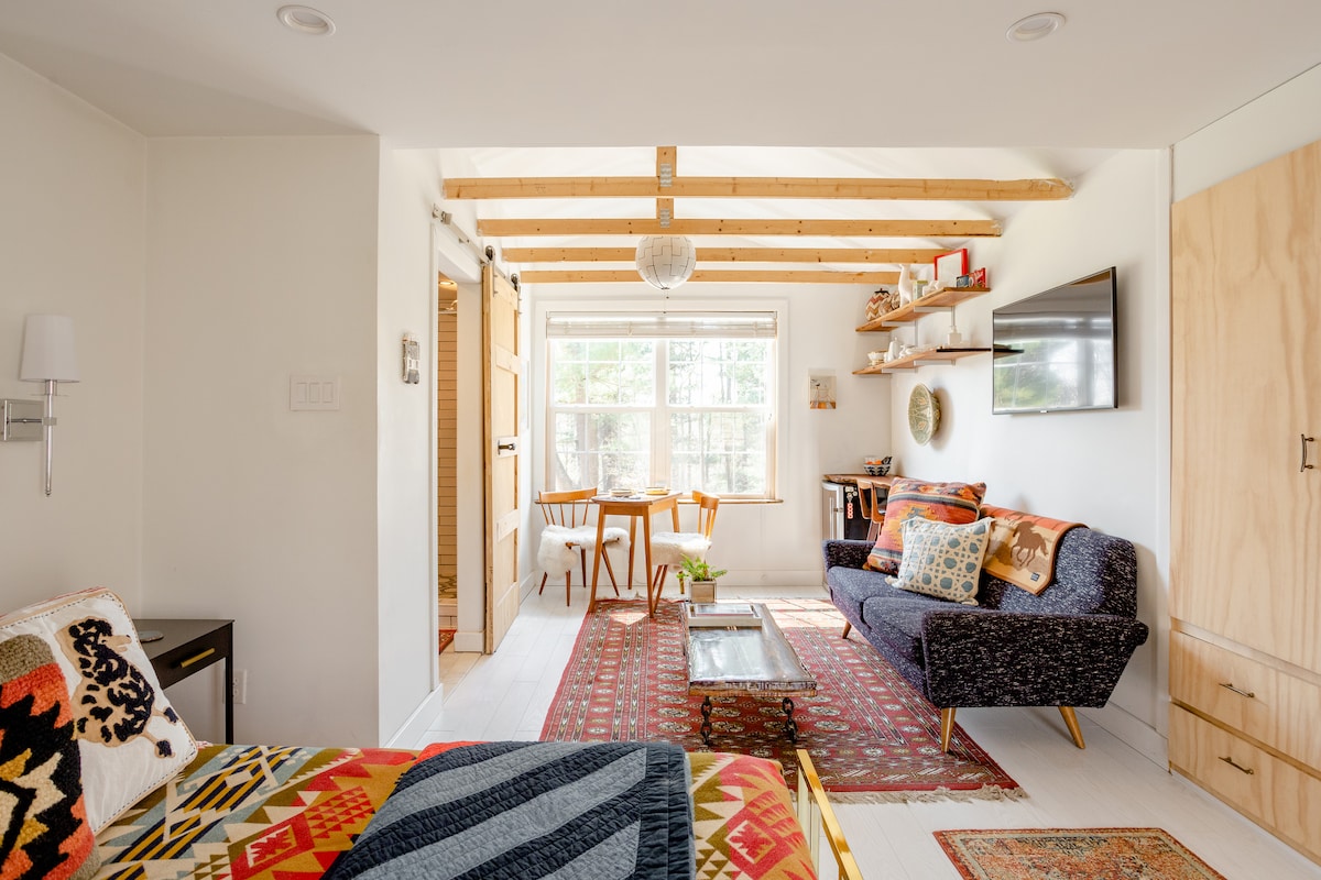 Enjoy the view of the treetops outside this secluded and bright studio while listening to limitless free music on the smart speaker. Unique touches include exposed beams, sliding barn door and European-style bathroom with large tiled shower. Enjoy original artwork hanging on the walls, a nod to Philadelphia's thriving art scene. Designed and decorated using a combination of American & European influences, the high quality finishes and accessories make this 280 square foot space feel like home.