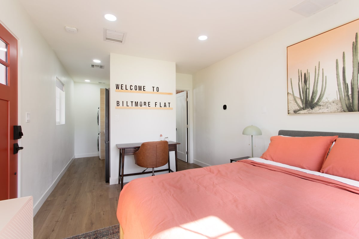 Welcome to your private casita (tiny home) in the heart of Midtown. Located right across the street from Starbucks, Buffalo Exchange, and the famous Taco Guild, relax comfortably with vaulted ceilings, a spacious layout, outdoor patio, and a quiet bedroom with a Queen-size bed — perfect for solo travelers or couples. Plus, the Light Rail station is walkable, which goes to Uptown, Downtown, the airport, Tempe, and Mesa. You are only: 7 mins to Downtown 9 mins to the Airport 15 mins to Scottsdale