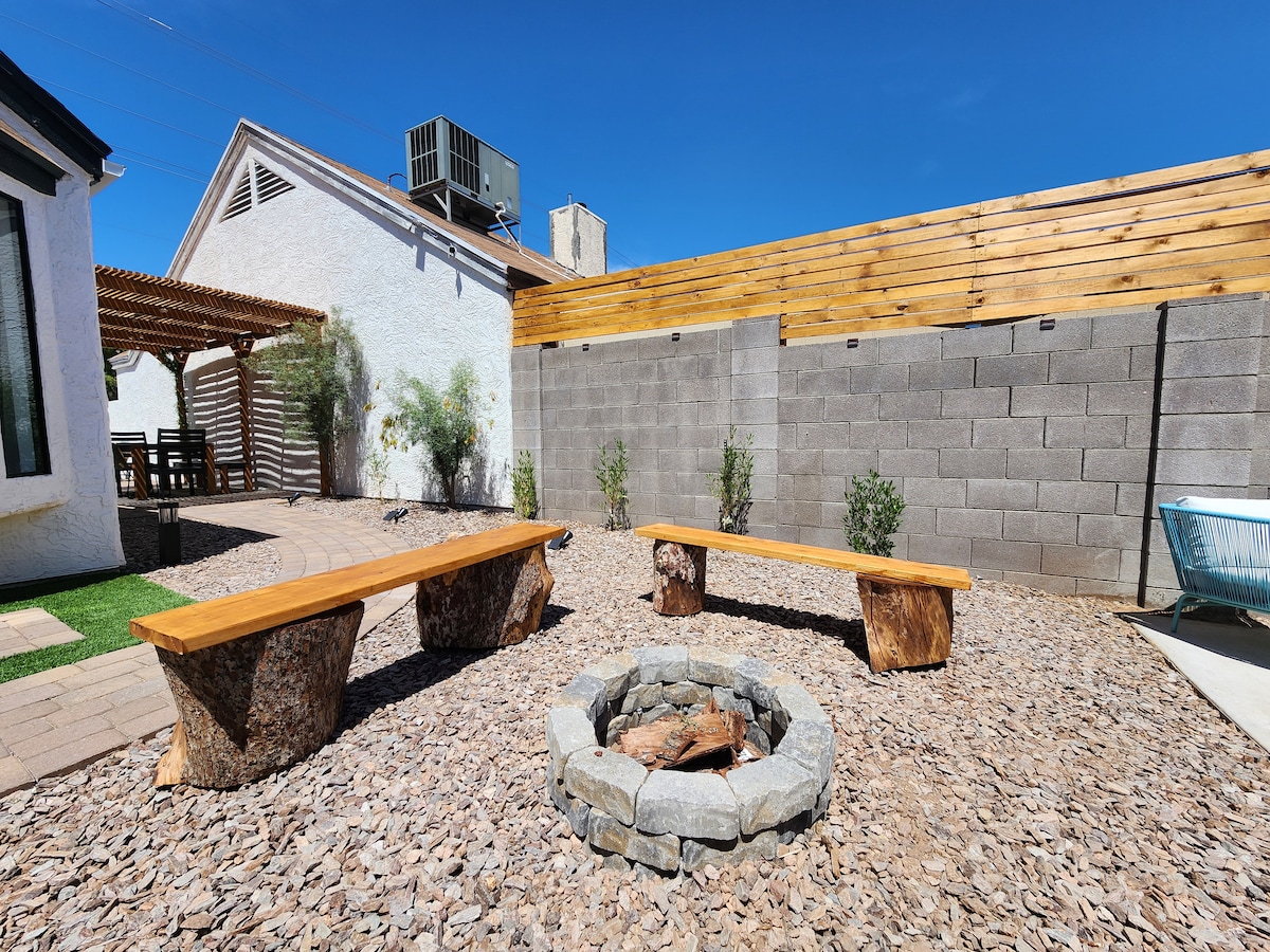 🏊 Year-round relaxation in heated saltwater pool & spa (gentle on skin/eyes) 🔥 Cozy up to fire features 🍳 Fully stocked kitchen + outdoor propane BBQ grill 🎱 Game room with pool table, foosball, darts, & big-screen TV 🌞 Outdoor dining area & bar for enjoying AZ weather 📺 Outdoor TV for games/movies while soaking in the spa 🚗 Easy access to 2 major freeways 🎨 Artfully & uniquely decorated Resort-like escape in Phoenix (Glendale mailing) – perfect for family, golf trips & holidays