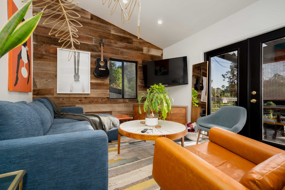 This 1-bedroom/1-bathroom house is 15-20min drive from Dodger Stadium. Built in the early 1940s, its decor is a nod to that era's timeless charm. Blackout drapes enhance the sleeping areas for a restful night's sleep. The beverage bar features ample cabinetry, an accent wall with backsplash, and unique open live edge shelves, crafted from the old avocado tree that once graced the patio. The patio has since been transformed with outdoor furniture, making it perfect for leisurely moments outdoors.