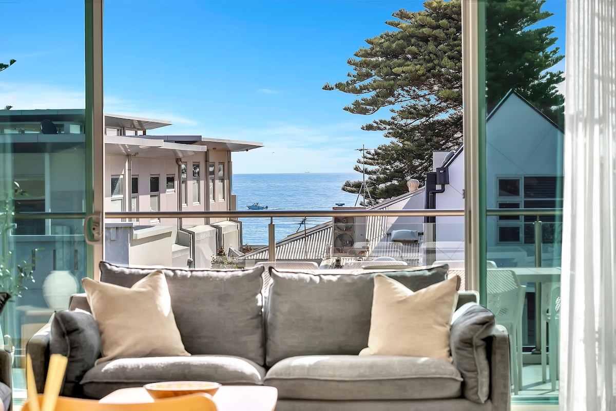Pearl is a cosy, bright and beachy luxe, two bedroom, two bathroom unit with stunning sea views from the open-plan kitchen, living room and the spacious main bedroom. Perfect for a couple or four friends wanting to unwind and reconnect. Recently renovated by “Nest Built”, no expense has been spared to create this designer beachside retreat. The moment you walk through the pastel blue door you will be in awe of its thoughtfully curated interior, transporting you into that blissful holiday mode.
