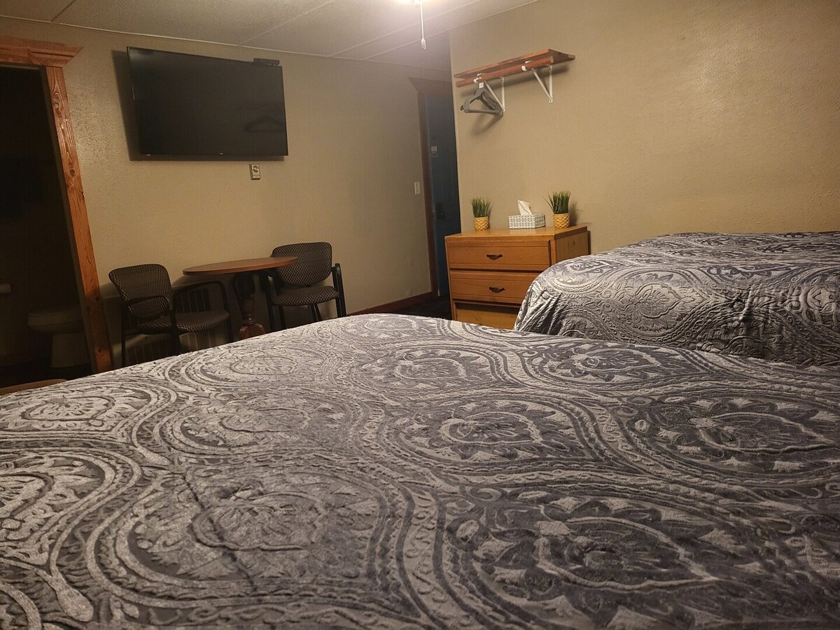 Recently renovated and perfect for solo travelers or couples. It features one queen bed, a small desk for work or planning, and a TV for unwinding after a long day. Additional conveniences include a mini fridge, a coffee station, and a clean, updated bathroom. The large window adds natural light, and an extra blanket ensures your stay is cozy and comfortable. A great choice for anyone seeking a refreshed and functional space.