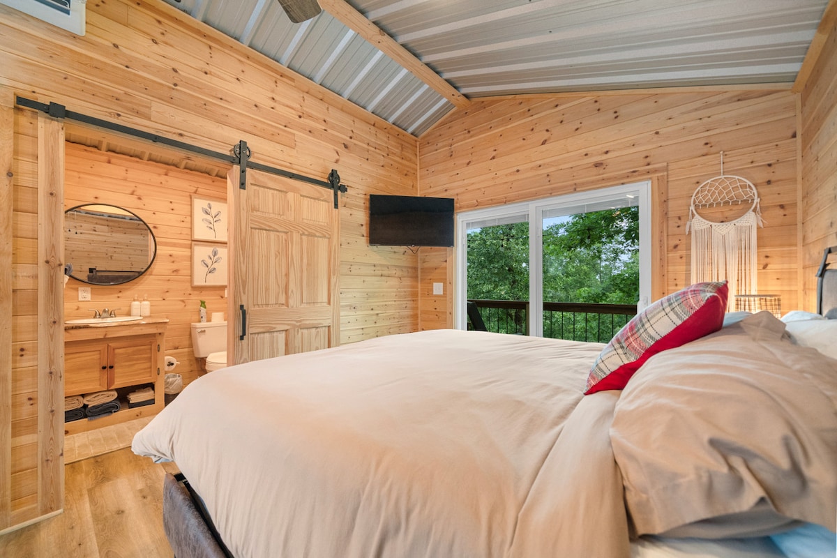Built 2018, inside bathroom remodeled 2023. Studio cabin. King bed, adult twin bunk beds, large leather sofa, big covered deck, swing, grilling, soaking. Beautiful spot relaxing, soakin, float or exploring Surrounded by trees/deers. Hiking trails We have Collier & Caddo Cabins. Prettiest creek! Gurgling/cool crystal clear No dog fee! Hardwood floors, free long-distance, Patio overlooking creek! WiFi & directtv. Trees, deers & bonus fully plumbed Out house! Please stay on our property & creek!