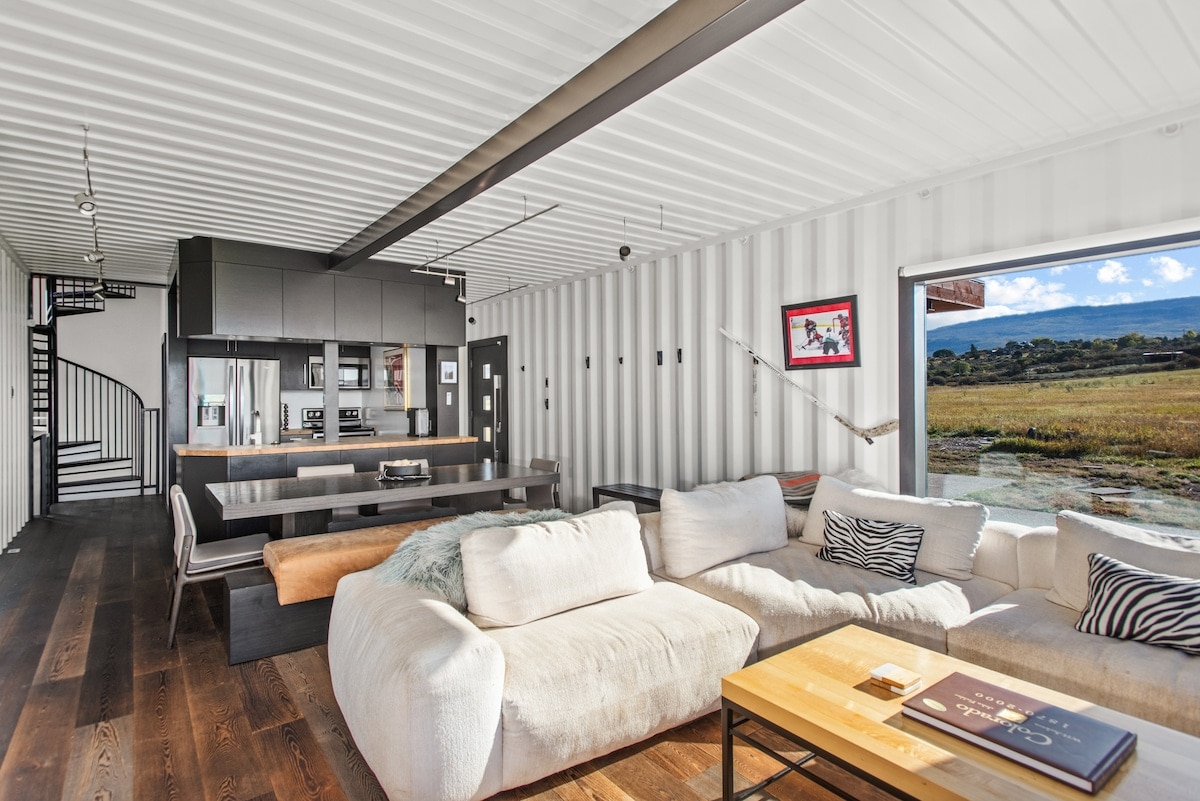 A modern container home on thirty-five private acres of Missouri Heights, roughly a thousand feet above the Roaring Fork Valley floor. Large picture windows in every room frame Mt. Sopris and the Elk Mountain Range without interruption. Clean lines, considered design, and no noise between you and the landscape. The nearest neighbours are horse farms. The rhythm here is the land’s, not a schedule’s. Fifteen minutes to Carbondale, twenty to Basalt. Reserve your stay.
