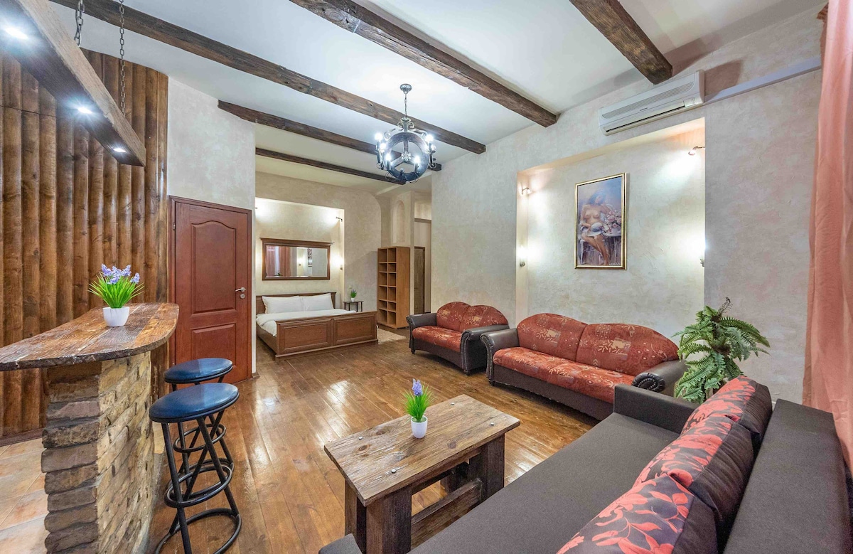 Апартаменти розташовані у самому центрі Києві, біля станції метро «Майдан Незалежності». Ці апартаменти підійдуть для людей, які цінують мінімалізм та комфорт. Інтер'єр квартири не перевантажений зайвими елементами та виконаний у сучасних тенденціях. Поєднання різних фактур («цегляна кладка», дерево) виглядає стильно і гармонійно.