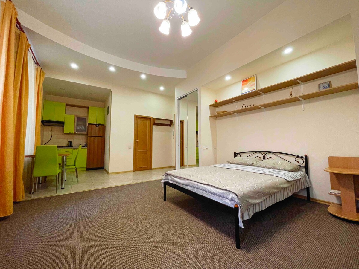 Однокомнатная-студия в центре Киева. Апартаменты имеют все необходимое для комфортного проживания. Для комфортного сна имеется кровать и удобный диван. Журнальный столик, телевизор, кондиционер , Wi-Fi. Квартира оборудована полноценной кухней с бытовой техникой и всеми столовыми приборами. Уникальность квартиры заключается в ее расположении- центр столицы. В 100 метров от фонтанов Майдана, Ул. Крещатик, Владимирская горка, Мариинский парк, Европейская площадь.