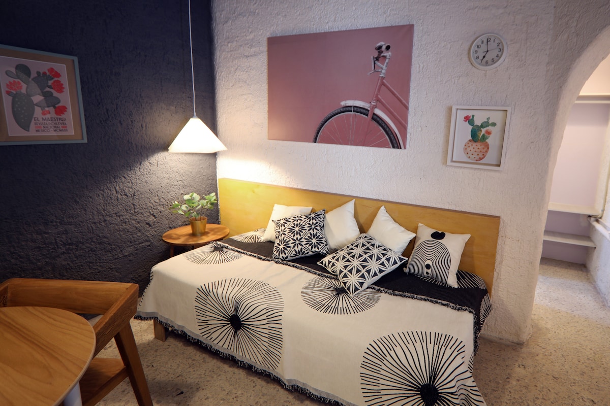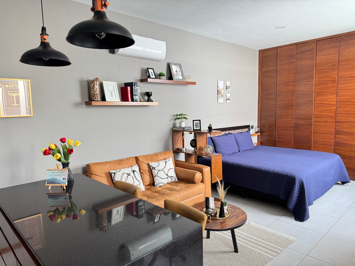 Disfruta de la comodidad de este "Estudio" tranquilo y céntrico. Ubicado en la parte trasera de mi casa con entrada independiente. Equipado con aire acondicionado, WiFi, Smart TV, además cuenta con estacionamiento cerrado y gratuito dentro de las instalaciones. Hay un patio grande y 2 terrazas compartidas en donde sí se permite fumar. La cama es tamaño matrimonial.