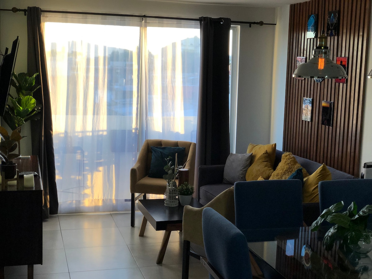 Disfruta de este céntrico y acogedor alojamiento. Cerradura práctica electrónica. Capacidad de 5 personas y 2 estacionamientos amplios. Contamos con 2 habitaciones: cuarto principal con cama king size, baño y balcón privados, y cuarto secundario con cama matrimonial (ambos con Smart TVs y amplios armarios). Sala con balcón y sofá cama. Cocina completa con todo lo necesario preparar/calentar tu comida. Amenidades (jacuzzis, gimnasio, terraza y sala de estar). ¡Descansa, convive y disfruta!