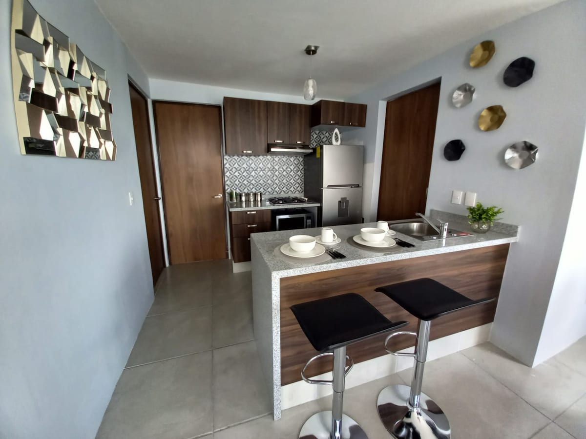 Modern new apartment with a stunning city view of Guadalajara. Located in a secure tower with 24/7 security and private parking. Only 5 min from Expo Guadalajara, 8 min from La Minerva, and 10 min from Chapultepec and the American Consulate. Perfect for business trips or leisure stays: families, groups, and professionals. Enjoy 2 bedrooms, 2.5 bathrooms, a bright living room, fully equipped kitchen, and fast WiFi for work or relaxation.