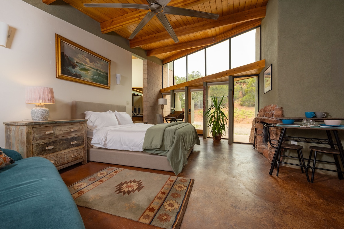 (No pets) Choose silence, solitude in our 12'x14' AIR CONDITIONED furnished hut, with a picture window view of Mesa; bed, desk, rocking chair, kitchenette. (1 guest only) and Wi-Fi. Space dedicated for meditation, prayer, writing. Private shower 90 steps away, inside main house. Hiking trail minutes away. Vaccination recommended. (Note: our second retreat space, inside main house, has private bath, kitchen use, library and LR.)