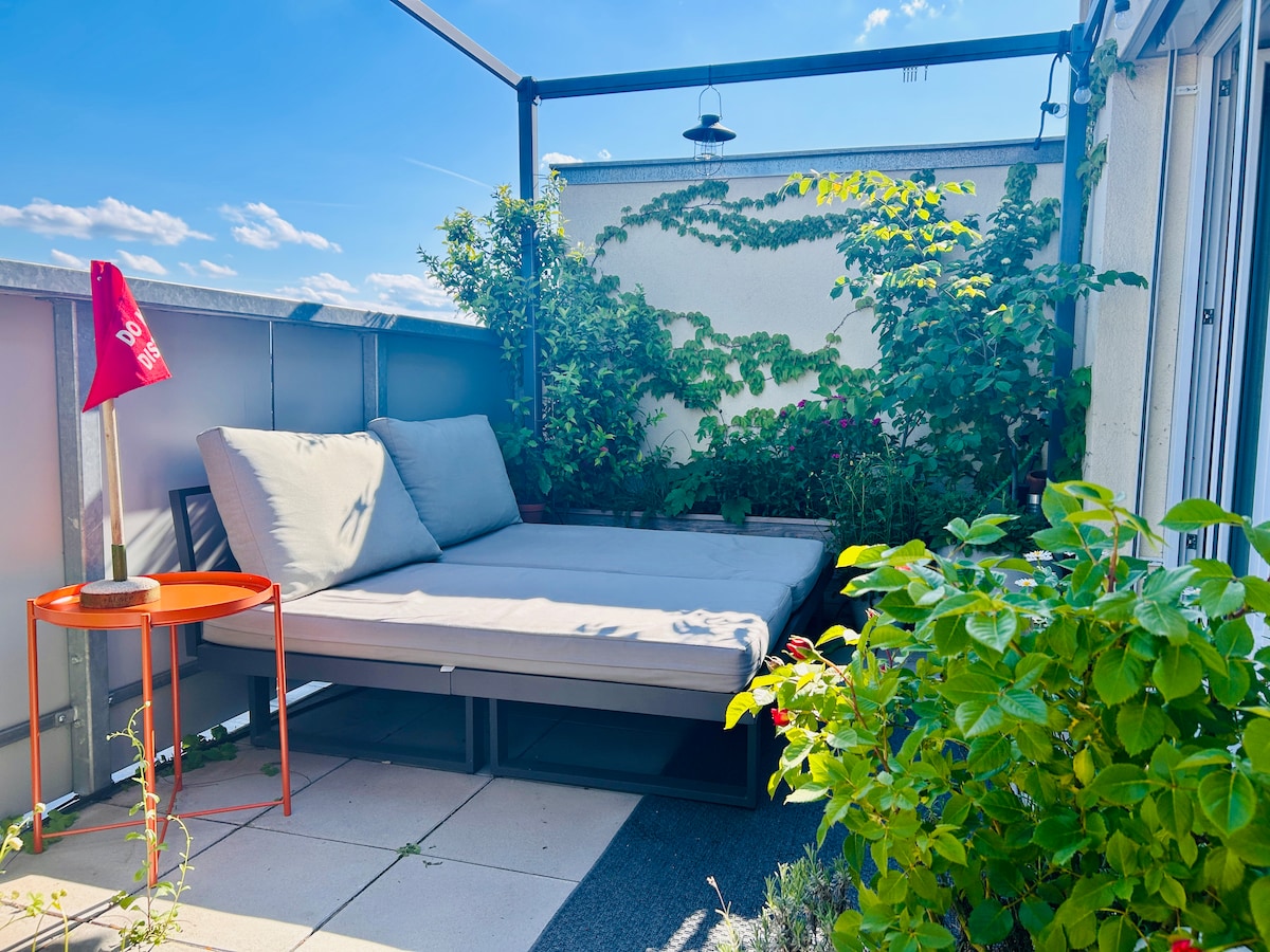 New 76m² roof terrace apartment next to Westbahnhof and Mariahilferstraße. Stay in a new trendy apartment with roof terrace (with a wonderful view over vienna), kitchen, bathroom and living room and two bedrooms. The couch in the living room can used as a bed. Schönbrunn and the city center are within walking distance.