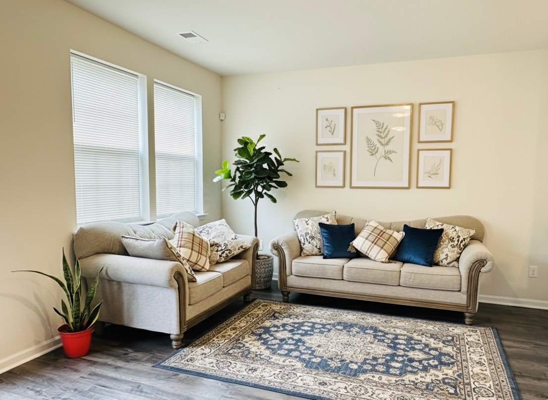 Beautiful, cozy, sunny room with a super comfy L-shaped sectional sofa. Super clean and spacious fully equipped Eat-in kitchen with dishwasher, stove, oven, microwave, regular and K-Cup coffee makers, Micro-wave, Toaster, Pots, Pans, Utensils, and Silverware all provided. The apartment includes (2) 43" Flat Screen TVs; streaming HULU-Live, Amazon Prime, Disney Plus. Also, a little work desk area provided Free washer/dryer access and Free parking, (short-term lease available).