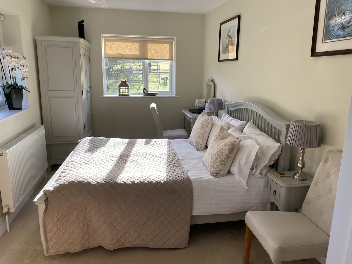 Cottage garden setting in Lechlade, perfect for relaxing and exploring the Cotswold area. Situated close to centre, River Thames, shops, and restaurants. Ample free street parking .The guest suite has its own entrance hall, double bedroom and modern en-suite bathroom with bath and rain shower. Egyptian cotton bedding, robes, slippers and quality towels. Freeview TV and BT Wi-Fi. Included is a very generous continental breakfast with home-made bread, pastries,preserves and garden produce.