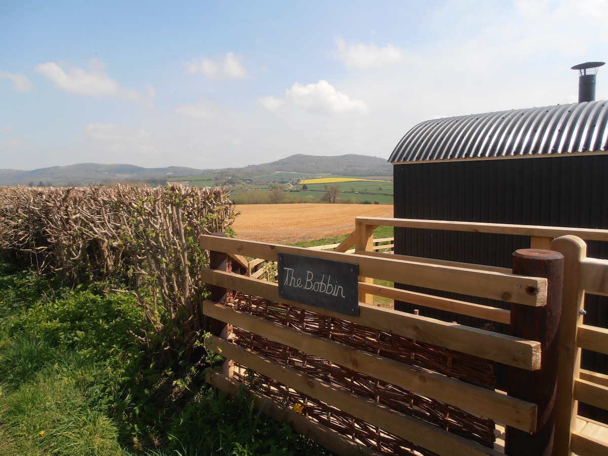 'The Bobbin' boasts the most incredible views of the Malvern Hills, from Midsummer Hill in the south, right along their length to North Hill. It is entirely self-contained (double bed, kitchen area and shower/toilet, all connected to the mains supply) with its own entrance from the country lane, its own garden and surrounded by beautiful Herefordshire countryside and wildlife. It is ideally placed for walking and cycling, exploring nearby attractions or simply relaxing with a book.