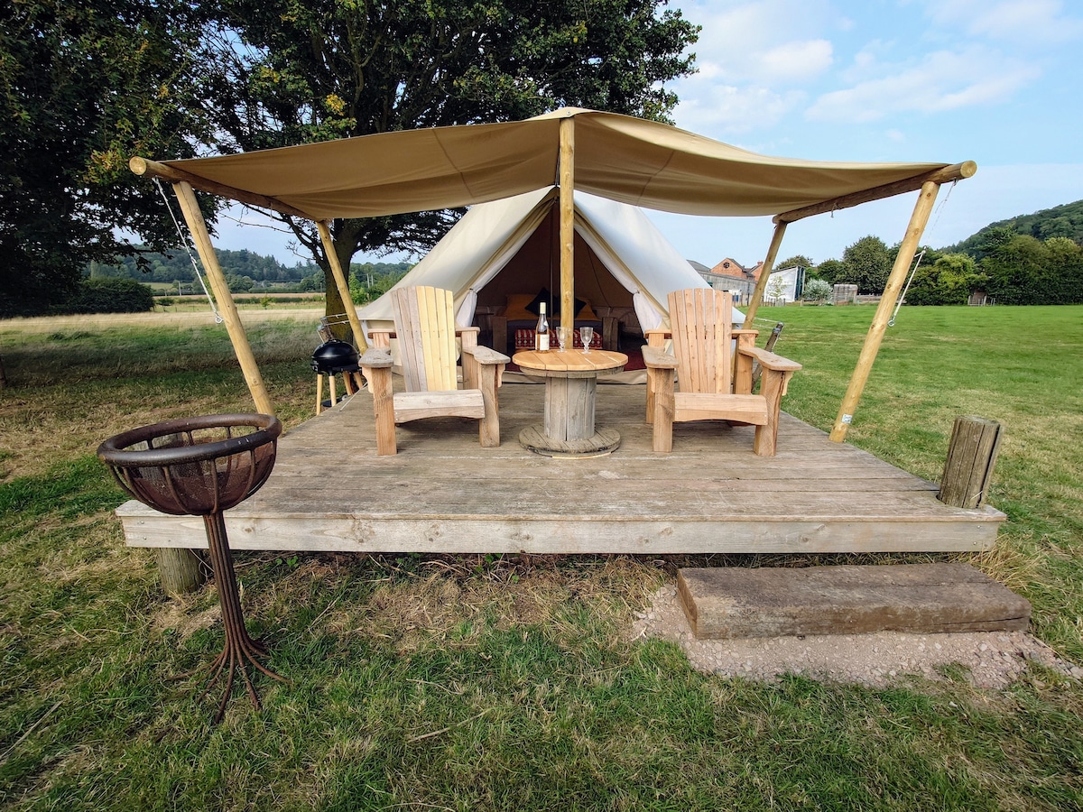 Enjoy your own secluded corner of the field on our small family run farm deep with in Herefordshire. The bell tent is nestled with in a group of maple trees, it is set off the ground and features a cosy interior a comfy king size bed with fresh bedding. You have your own private deck area complete with BBQ fire pit and seating.The bell tent is completely off grid so you can spend your day unwinding.You have your own modern bathroom just a short stroll across the field. No smocking No pets
