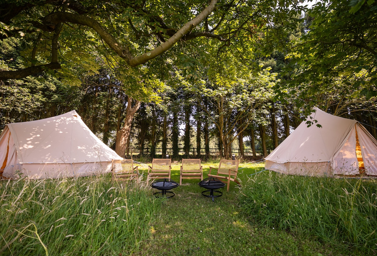 Guests have exclusive use of the private woodland, games field and excellent facilities. We have three luxurious sleeping tents and a huge lounge tent, which surround a central area with a fire pit, covered outdoor kitchen and bar, covered banquet table and the much favoured Scandi BBQ Hut. Our site is perfect for 2-3 families or a small group. The price is for the whole site. At quieter times we will offer a discount for use of 2 tents only- get in touch to discuss your requirements.