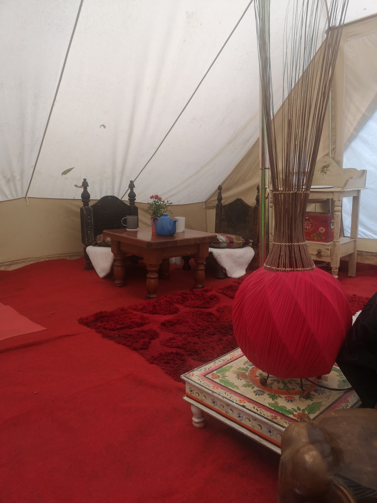 Welcome to Grand Mahal, a 4-bedroom glamping haven, offering a unique blend of rustic charm and modern luxury. Personal Amenities: ✓ Living Room ✓ Wood-Burner Hot-Tub ✓ Outdoor Kitchen ✓ Luxury Shower ✓ Toilet ✓ Cutlery & Cooking Utensils + Pot & Pans ✓ Firepit ✓ BBQ ✓ Picnic Table ✓ Awning ✓ Outdoor Seating Communal Amenities: ✓ Pizza Oven ✓ Honesty Shop ✓ Seating Area ✓ Volleyball & Badminton Net ✓ Rosewalk ✓ Sleep with the sheep ✓ Hammocks + Books ✓ Kids Play Area ✓ Fairy Garden