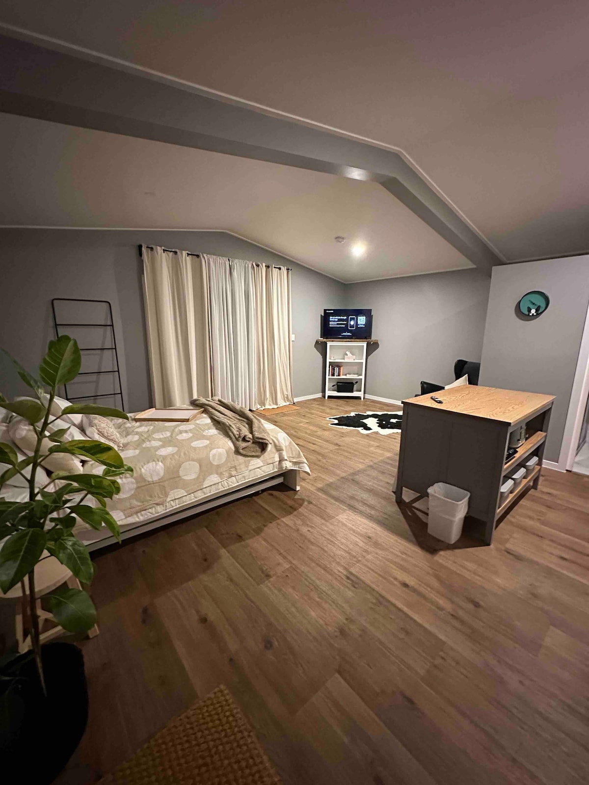 A rustic studio attached to the family home, with its own entrance. Refresh with a complimentary cheese board. Enjoy the plant filled space where you can enjoy a breakfast of fresh bread, eggs, cereal, milk, butter, jam, honey & coffee. At night light the fireplace with the wood provided. Take the picnic basket and rug provided, & explore the Mountain. We are located on the Main Road leading into Gallery Walk. If you are sensitive to road noise we might not be the perfect place for you.