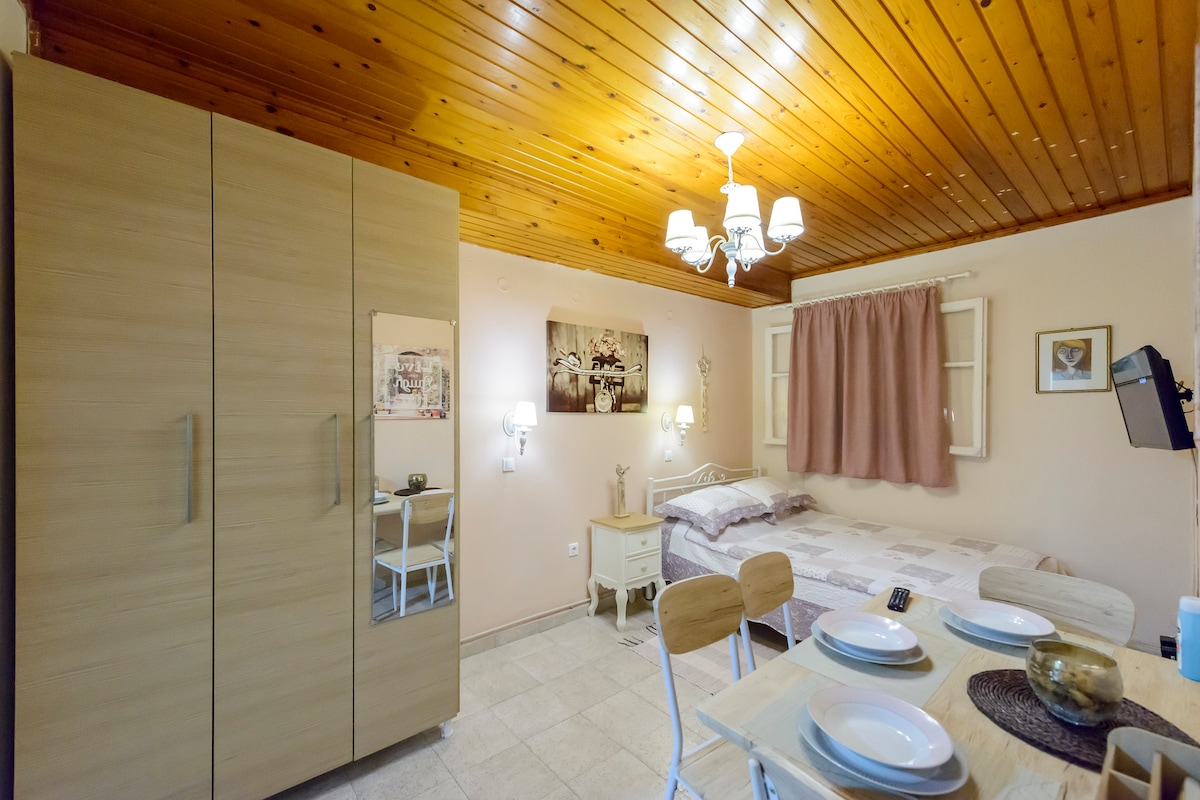 A beautiful and comfortable studio which includes a bedroom, a cosy kitchen, a bathroom and a private balcony with wonderful view! Reasons that my studio will like: light, comfortable bed and comfortable environment. My space is suitable for couples and families.Τhe complex consists of 5 studios and 2 houses.