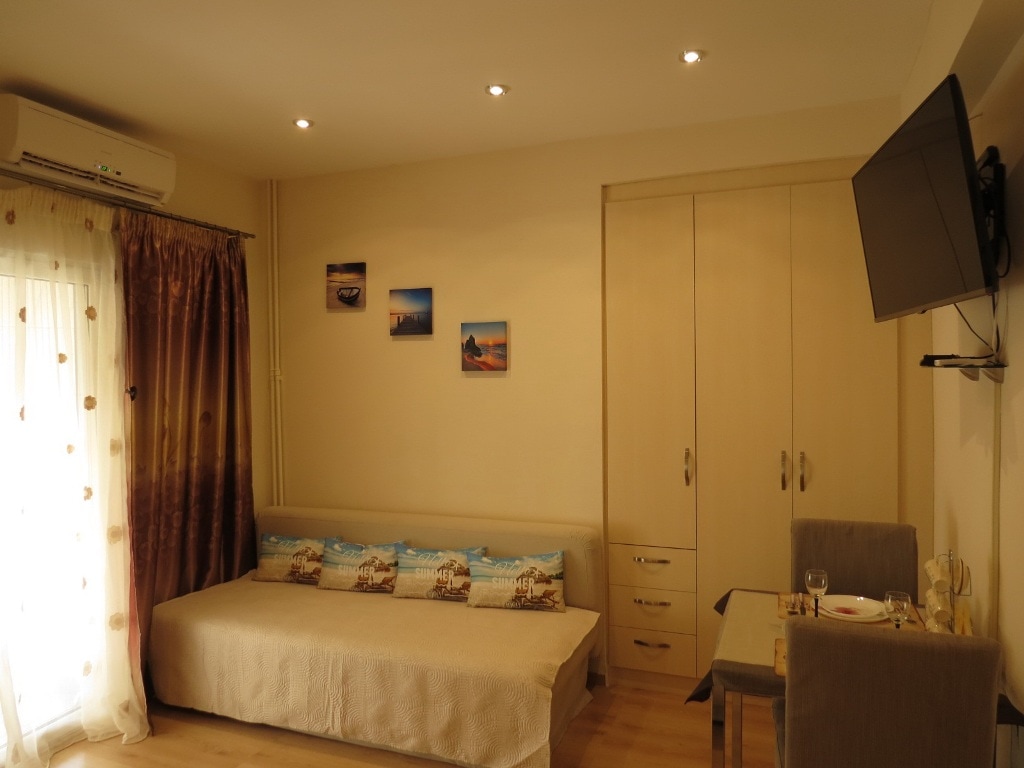 NON smoking apartment! A small appartment studio 25 sq m. NEAR the sea, just 50m. (is across the road) no sea view. For 2adults. Small kitchen corner is fully equipped. with a beaches and nice walking area. Bus stops and tram stations are near to take you to the City centre (10min by car. 30min by tram and bus). Bars, tavernas, restourants, are nearby. Also 2 big supermarkets. (50-100m) The beaches are free ! I will be more than happy if you to ask any question about my appartment!