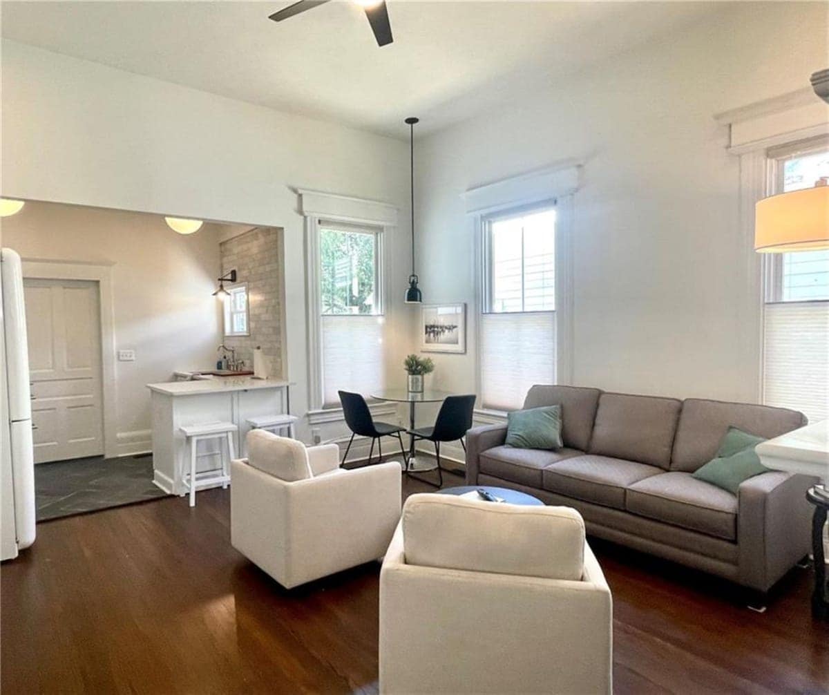 The Freddie is a newly updated 3-bedroom, 3.5-bathroom coastal cottage in the heart of St. Simons Island. It features an open floor plan with a fully equipped kitchen, dining area for six, living room with a fireplace, and a screened porch for relaxing. The master bedroom with a king bed is on the first floor, and upstairs offers a bunk room that sleeps five, a king guest bedroom, and a sitting area with a coffee station. All bedrooms have ensuite bathrooms. The home comfortably sleeps nine gues
