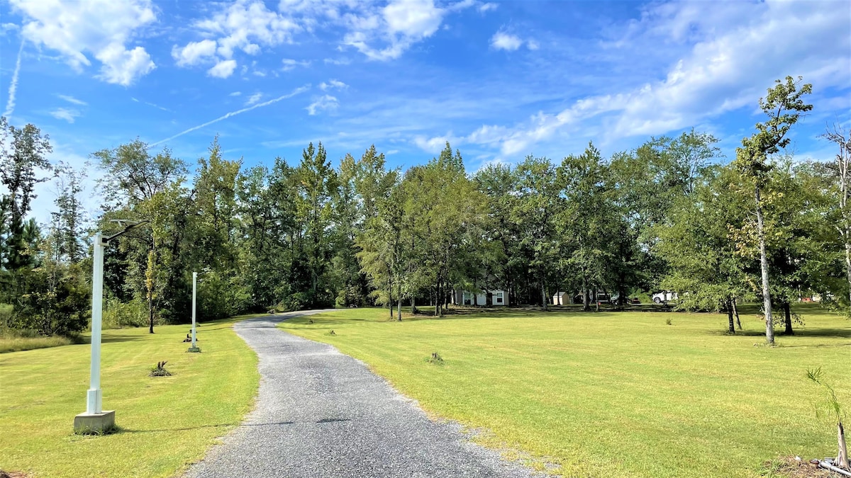 If you're looking for peace & comfort in the country yet want to be close to amenities of the city, look no further. This home is 2 minutes from I-95, stashed away on a 26 acre farm - you may see a wanderer! :-) Marsh views are within a short walking distance & within 10-15 mile of local beaches: St Simons & Jekyll Includes combo grill for use, fire pit and several indoor/outdoor games and activities for all ages. RV electric hookup in the front! *Pets must be approved prior to reservation*