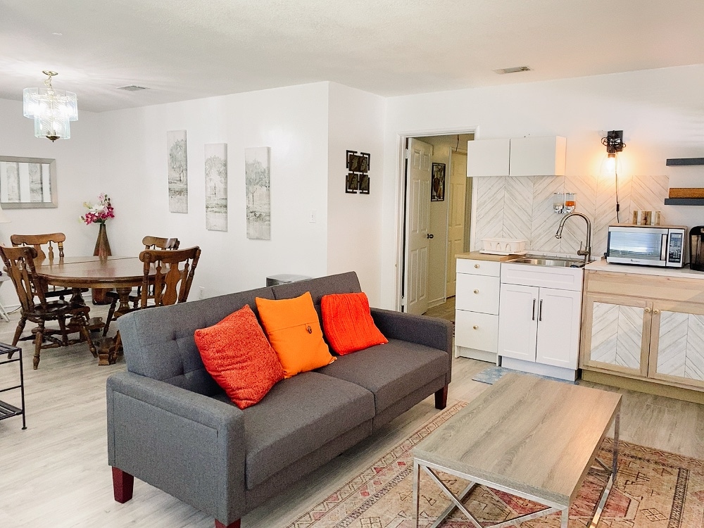 This is our largest guestroom and takes up the entire upstairs end to our home. It has a small kitchenette with a refrigerator, microwave and Keurig. The bedroom has a large flat screen TV, dining table and sofa to private a more comfortable private space for our guests. It also has a private bathroom with a shower. Just minutes away from St. Simons and Jeykll Island as well I 95 and three airports. Please, no dogs unless they will be with you the entire time.