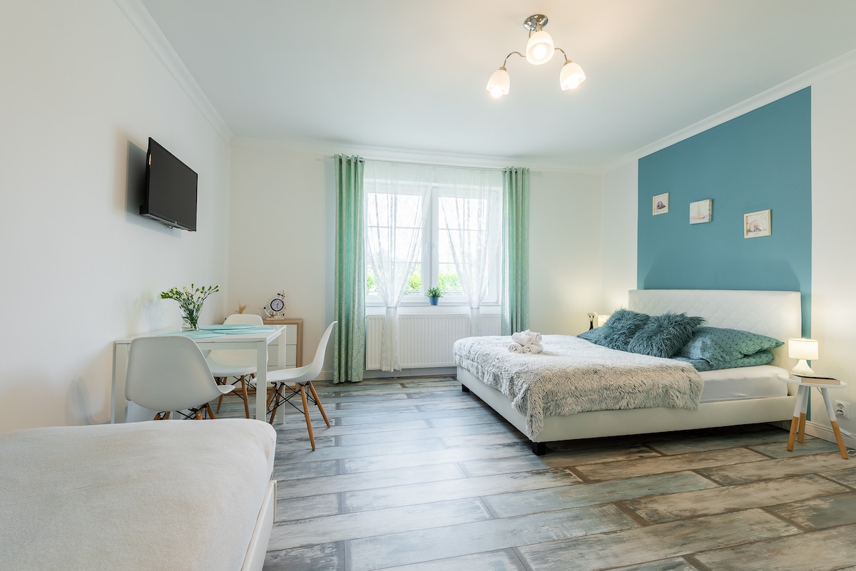 Komfortowy apartament w centrum miasta. Do dyspozycji całe mieszkanie 48 m - sypialnia z podwójnym łóżkiem oraz salon z aneksem kuchennym. W salonie rozkładana sofa . W pobliżu główne zabytki miasta. ( 400m ratusz miejski, 950 m - rynek starego miasta, zamek). Dostępne 1 bezpłatne miejsce na prywatnym zamykanym parkingu, tuz obok budynku. Ponadto w pobliżu również miejski parking (od godz.17 oraz w weekendy bezpłatny).