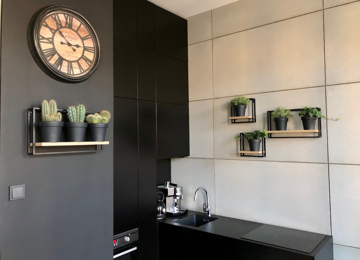 Our loft is truly one of a kind. Its unique features like 3.2 room height, three large windows and no wall between the lounge and the bedroom, form an open, bright living space in every corner of the suite. Modern, industrial interior design perfectly highlights apartment’s structure and creates a spacious but cozy feel. LED lighting behind the TV and below the couch contributes to the atmosphere at night and during the day.