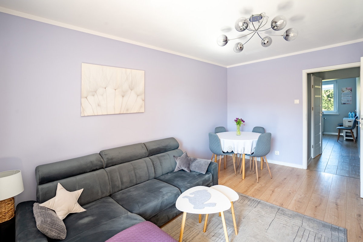 Mieszkanie położone blisko centrum (7km, 10 minut samochodem), w pobliżu przystanek autobusowy oraz bezpłatny parking pod blokiem. Apartament mieści się na osiedlu w miłej spokojnej okolicy. Wnętrze bardzo przytulne z wszystkimi potrzebnymi udogodnieniami, szybkie Wifi, Telewizor 55" z SmartTV (YT, Netflix, HBO GO itd.), kuchnia z wyposażeniem (talerze, kubki, szklanki, sztućce, czajnik, garnki, patelnie, piekarnik z płytą, zmywarka, lodówka, zamrażarka, pralka itd.).