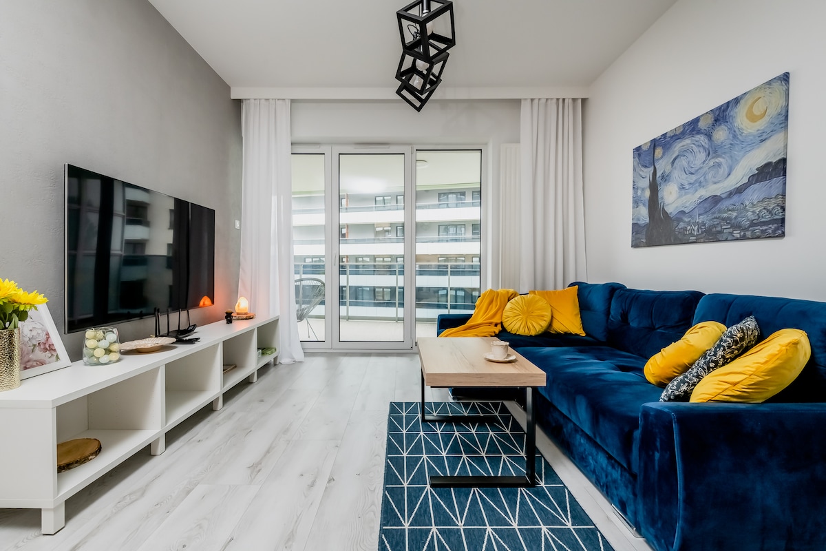Mieszkanie położone blisko centrum (7km, 10 minut samochodem), w pobliżu przystanek autobusowy oraz bezpłatny parking pod blokiem. Apartament mieści się na osiedlu w miłej spokojnej okolicy. Wnętrze bardzo przytulne z wszystkimi potrzebnymi udogodnieniami, szybkie Wifi, Telewizor 55" z SmartTV (YT, Netflix, HBO GO itd.), kuchnia z wyposażeniem (talerze, kubki, szklanki, sztućce, czajnik, garnki, patelnie, piekarnik z płytą, zmywarka, lodówka, zamrażarka, pralka itd.).
