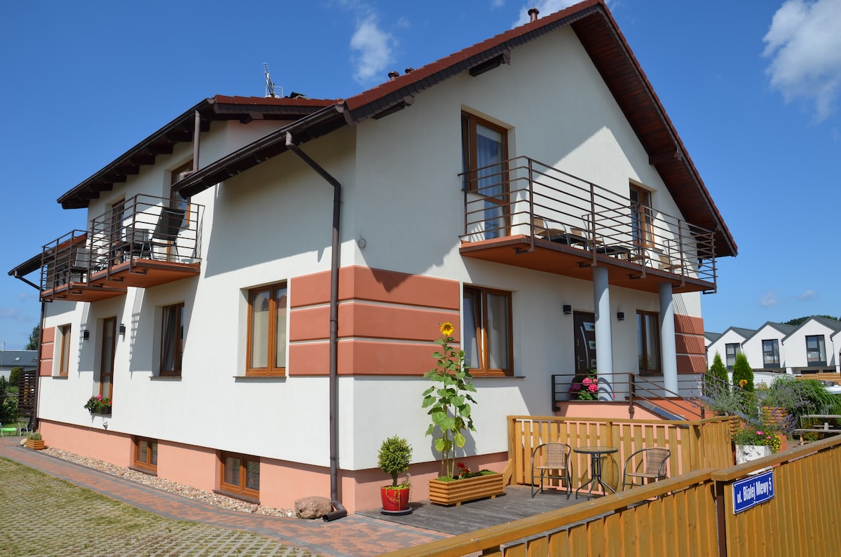 Oferujemy apartament w zabudowie bliźniaczej o powierzchni 90m2, przeznaczony dla 4-7 osób. Widoczny na zdjęciu dom składa się z 2 odrębnych apartamentów (Part 1 i Part 2). Każdy apartament jest niezależny i ma odrębne wejście. W pełni wyposażony - Pralka, telewizor z funkcją Smart, WiFi i wiele innych. Dwie sypialnie, salon, kuchnia, łazienka. Odległość do morza - 250m. Możliwość wynajęcia obu apartamentów razem jeśli są dostępne.