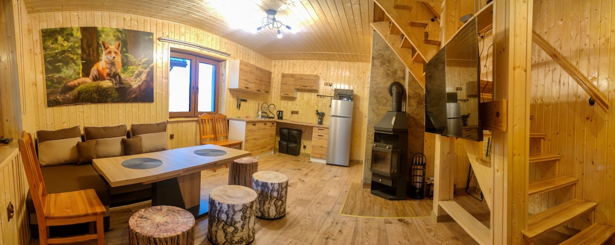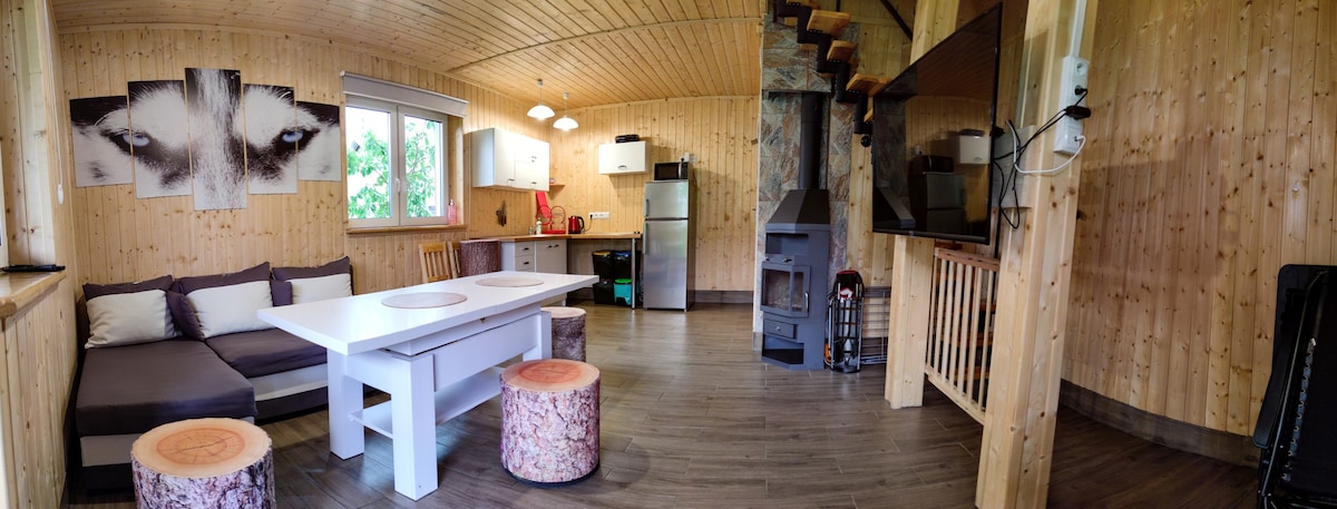 Domek "Wilk" to domek w zabudowie bliźniaczej wykonany z bali drewnianych. Na I piętrze znajdują się 3 sypialnie 2 osobowe, toaleta, natomiast na parterze: pokój dzienny, aneks kuchenny, łazienka z prysznicem. Przed domkiem można odpocząć na tarasie. Na terenie obiektu dostępna jest altana grillowa, miejsce na ognisko, basen odkryty(lipiec, sierpień) balia , sauna (dodatkowo płatne) salon gier, plac zabaw Bezpośrednio z obiektu można udać się na ścieżki spacerowe.