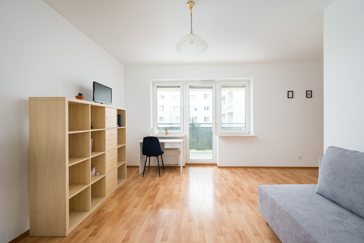 Komfortowy, w pełni wyposażony apartament w nowym budynku. Salon z otwartą kuchnią podzielony na część jadalną i wypoczynkową. W sypialni znajduje się duże łóżko i przestronna szafa. Jest także garderoba jako dodatkowe miejsce do przechowywania. W okolicy znajdują się sklepy, restauracje i kawiarnie Wyposażenie: klimatyzacja, ekspres, czajnik, żelazko, deska do prasowania, pralka Dojazd z Lotniska Chopina 20 min taxi 50 min komunikacja z Lotniska Modlin 50 min taxi 120 min komunikacja
