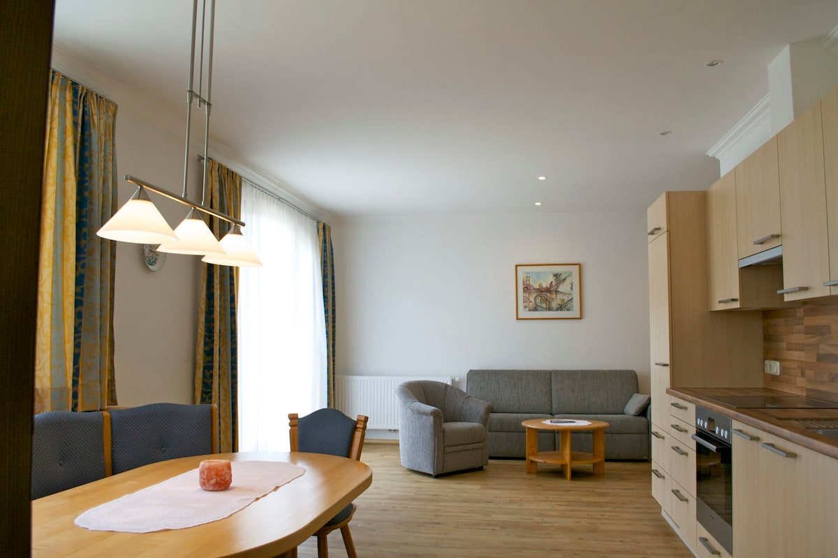Geräumige Ferienwohnung für zwei Personen mit einem Schlafzimmer, Zirbenbett, Terrasse, ausziehbare Couch im Wohnzimmer (bei tel. Anfrage für 1-2 Kinder), voll ausgestattete Küche, kein Teppichboden, großzügiges Bad mit Doppelwaschbecken, TV, Telefon, WLAN, Safe und Haarföhn.