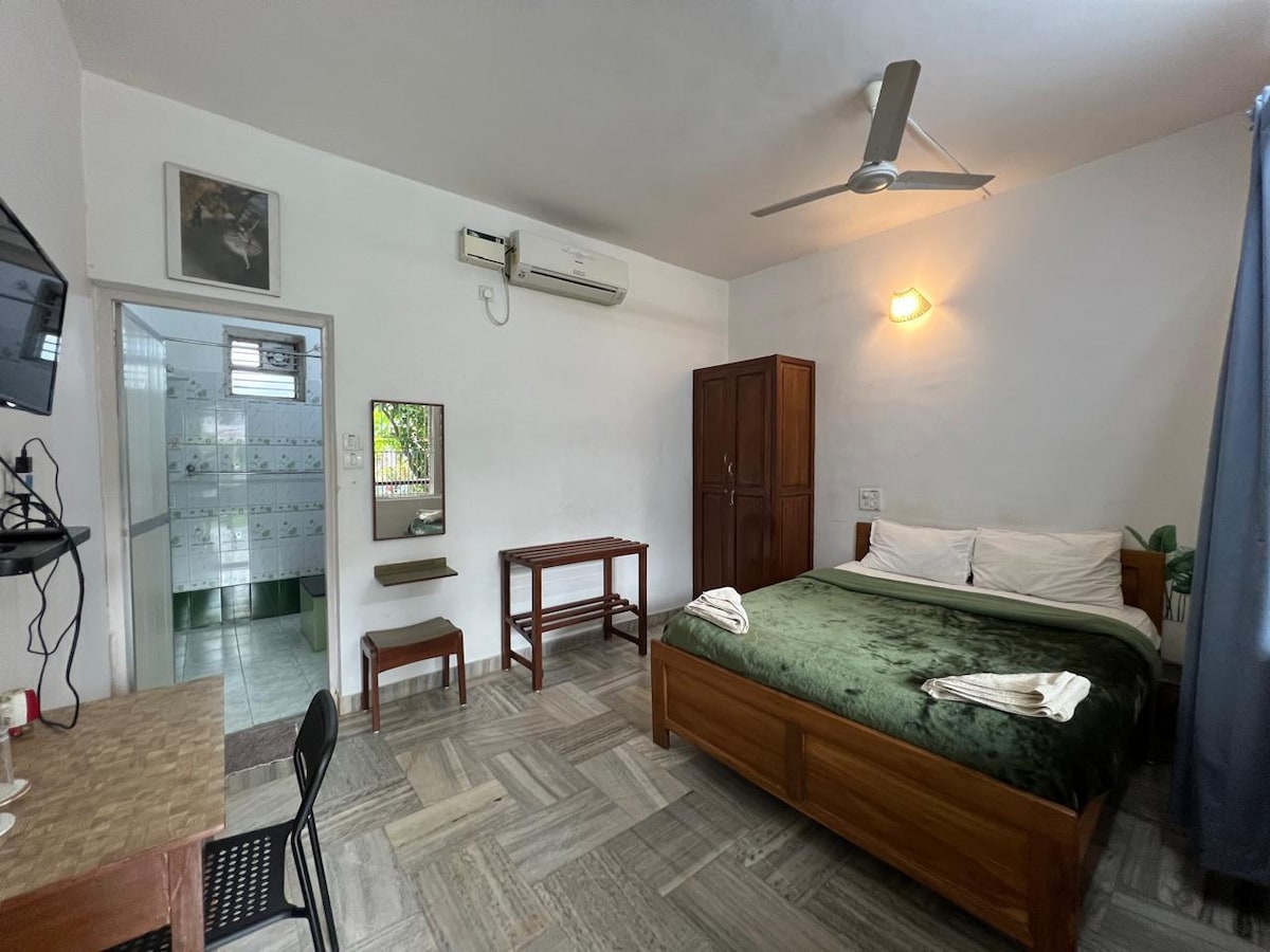 1 cosy room in our road facing villa on the grd flr in Assagaon. Strictly dog lovers only to book this room. We have dogs & we live here too. Located 6 kms odd to Anjuna , vagatore beaches. pool our fridge can be used by you inverter upto 3 hrs wardrobe attached bathroom toiletries on arrival only daily cleaning but linen change is chargeable pls free wifi & parking private pool clothes wash rs 150 per load plated veg or eggs breakfast ( not unlimited) others meals at 15% discount
