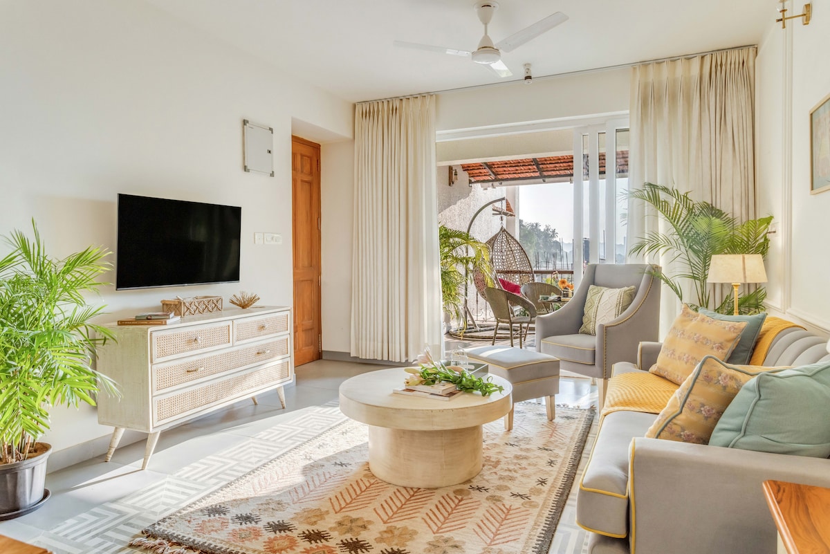 Welcome to White Feather Castle, a luxury 2BHK apartment, just minutes from Candolim Beach, North Goa. Enjoy stunning pool and river views from your private balcony. Perfect for families, couples and remote workers, with high-speed Wi-Fi, air conditioned home, fully equipped kitchen, daily cleaning, power backup, secure gated parking with swimming pool & Gym, kid friendly amenities. Steps from vibrant restaurants, nightlife, and famous beaches. Book your serene and stylish Goan getaway today!