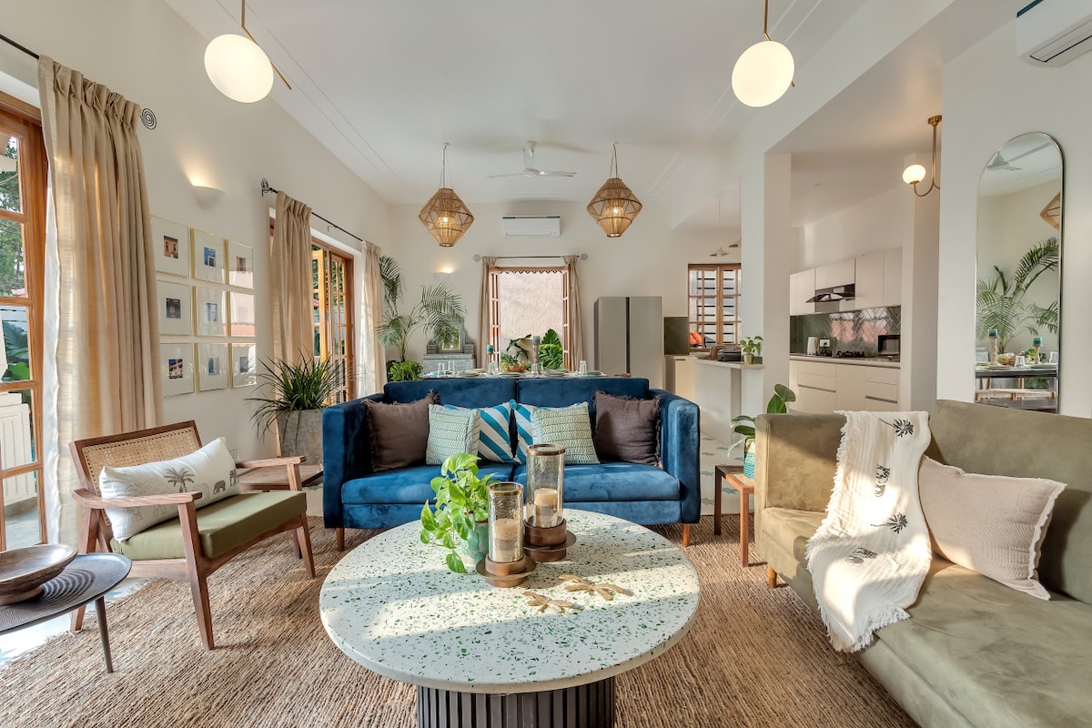 Nestled along Ozran Beach Road in North Goa, this charming villa offers a perfect blend of luxury and tranquility. Surrounded by lush greenery, it boasts panoramic views of the rolling hills, creating a picturesque backdrop for relaxation. The villa's design harmonizes with nature, featuring spacious terraces where guests can unwind and soak in the stunning sunsets. Inside, the airy interiors are adorned with modern amenities, ensuring comfort while maintaining a warm, inviting atmosphere.
