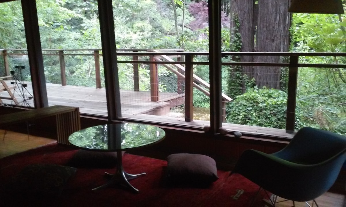 **Recently refreshed/re-furnished!** This house was named 'The Ranch House' by its architect Don Jacobs, this updated 70s cabin is a forest getaway with modern sensibility. The house is surrounded by redwoods & has 2 large decks, 1 w/ propane firepit w/ ample seating, the other w/ hot tub. Living room has picture windows w/ forest views & Morso wood-burning stove. Guests are encouraged to enjoy the hiking trails, pools, and outdoor amenities. House comfortably sleeps 4, plus fiber-optic internet