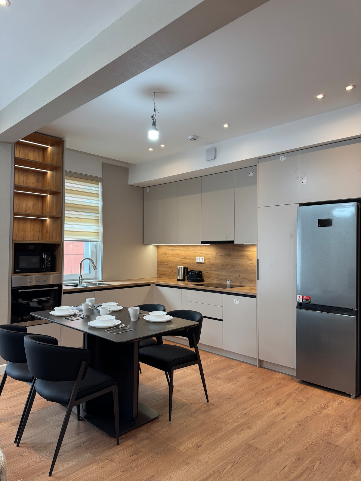 Stay in a fully serviced 1-bedroom apartment in central Ulaanbaatar. Located on the 4th floor of a modern building, this 66 m² unit is fully furnished with a 55" TV, high speed WIFI, cozy sofa, fully equipped kitchen, washing machine, luxurious bed and smart lock entry. Just steps away from the city's largest central park, supermarkets, top restaurants, cafés and more perfect for both business and leisure stays.