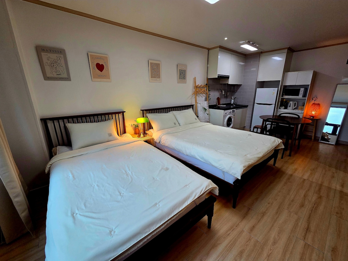'우리 가족이 머물기에 어떤 숙소가 적합할까?' 라는 생각으로 호텔을 운영 합니다. 우리 호텔은 정식 숙박업 허가를 받은 콘도형 호텔이며, 파스텔톤의 모던한 인테리어와 최대 8인까지 사용가능한 단체 및 가족 여행의 최적의 호텔입니다. 최상의 서비스를 제공하게 위하여 5성급 호텔에 사용되는 침대, 침구, 타월을 세팅 하였고, 스위트룸은 거실/ 주방, 침실 2개로 구성되며, 콘도형 호텔에 걸맞은 다양한 조리도구를 갖춘 편리한 주방, 넓은 거실, 붙박이장, 화장대, 암막커튼, 블라인드, 안전한 보안시설, 편리한 주차시설, 각 방마다 설치된 시스템 에어컨, 4~6인이 사용가능한 식탁, 4인용 소파, 침실에는 투매트리스 독립스프링 퀸 침대 1개, 1인용 침구류 3세트가 기본으로 세팅, 경추베게는 아주 편한 잠자리를 제공 할 것입니다. 에어비앤비 규정에 따른 매뉴얼에 따라 최선으로 청소와 소독을하고, 침구류와 타월을 최상의 컨디션으로 유지/ 세탁 합니다.
