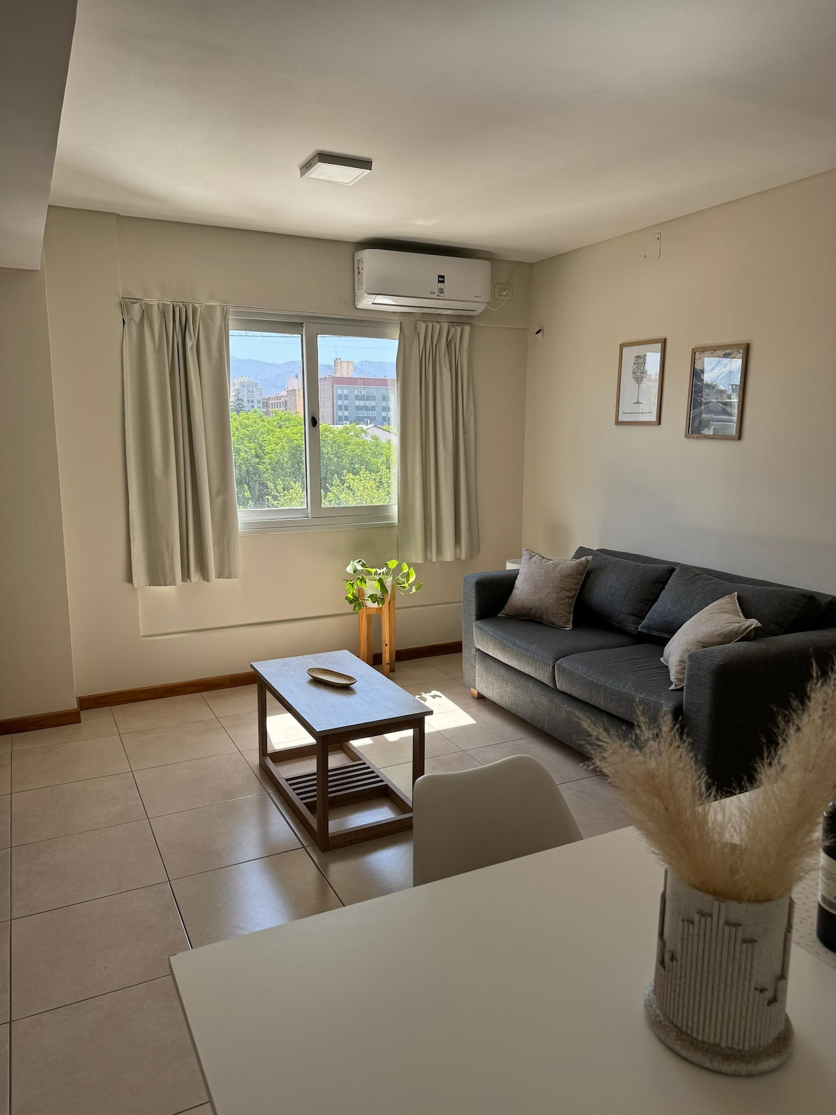 Immerse yourself in the authentic essence of Mendoza by staying in our new, comfortable, and tranquil apartment. Located in the heart of Mendoza: the Bombal neighborhood. A picturesque neighborhood with green spaces and plenty of specialty cafes. You are a 15-minute walk from the city center and General San Martín Park. The space features hot/cold air conditioning, a new mattress, Wi-Fi, direct TV, and private parking. We provide guidance on wine tourism.
