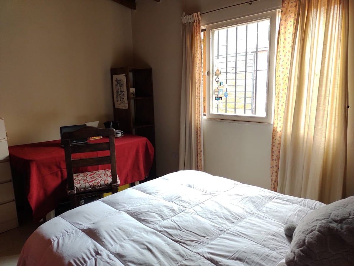Cálido alojamiento perfectamente ubicado. Dos habitaciones, un baño completo. Dos camas dobles (pueden solicitar 2 singles en un cuarto) Microondas, heladera, tetera eléctrica, cafetera, platos, tazas, vasos, cubiertos, copas. Living comedor con sofá y mesa. Zona residencial a 1 cuadra de Avda San Martín, 200 metros de la municipalidad de capital, 12' a pie de la peatonal Sarmiento. Se puede estacionar en la calle frente a la casa. Tiny garden con hamaca y barbacoa.