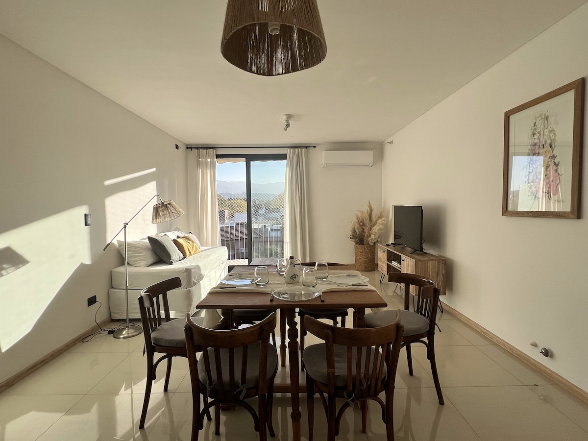 Departamento hermoso y funcional. Muy cerca de las principales avenidas comerciales, como los paseos gastronómicos . A 200 mts del paseo Alameda, donde se encuentra alquiler de bicicleta y acceso a todos los medios de transporte. Su equipamiento es a Estrenar.!! Smart tv Android, con canales digitales, conectado a wifi. Aire acondicionado FRIO CALOR Una hab. matrimonial y otra hab. con dos camas de una plaza. Baño y Antebaño. Luminoso balcón. Cochera cubierta Gratis a 100 mts Automatizada